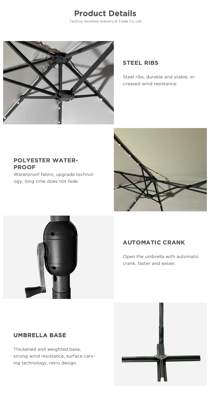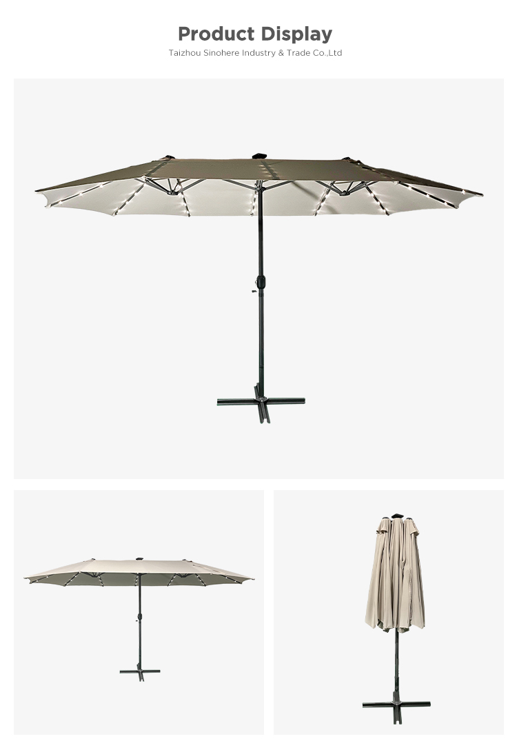 Steel ribs:12*18*0.45mm, Each umbrella has 4 LED lights and a 1.8W solar panel battery